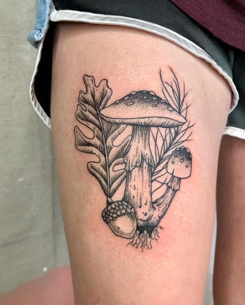This tattoo displays oak leaves, acorns, and wild mushrooms in a balanced forest composition. Fine black lines and gentle dot shading bring natural texture to each leaf and mushroom cap.