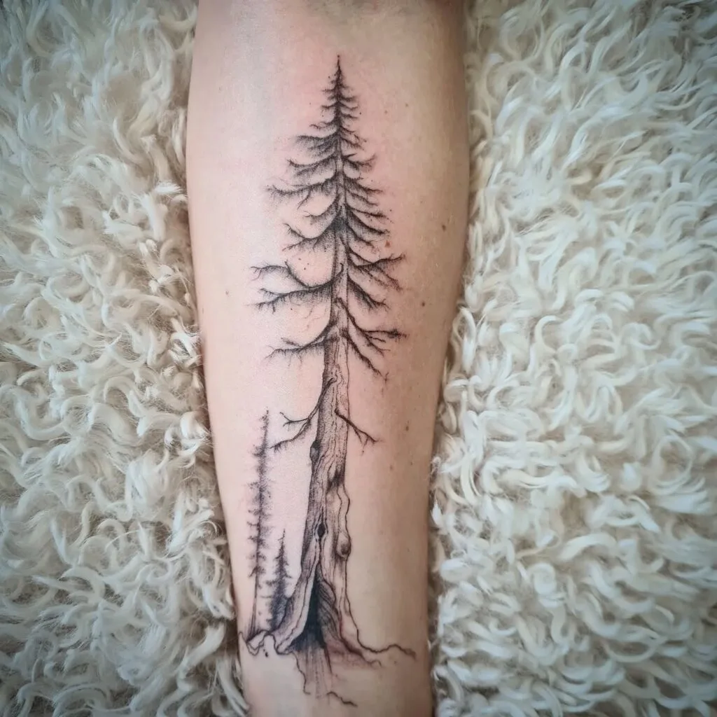 This tattoo features a towering redwood tree with intricate bark details and fine, natural shading on each branch.