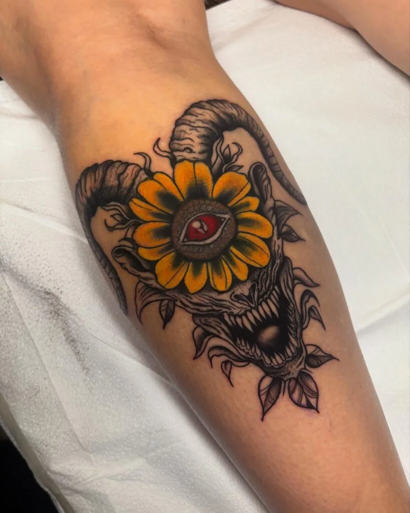 This tattoo mixes a fierce demon skull with curling horns and a bright sunflower framing a red central eye.