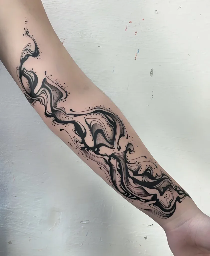 This tattoo streams across the forearm with bold black waves and swirling strokes that feel alive with motion.