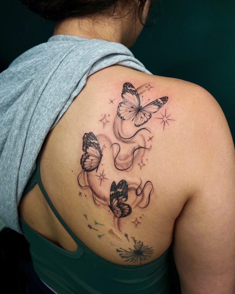 This back tattoo features three graceful butterflies in flight, surrounded by swirling ribbons and delicate starbursts.