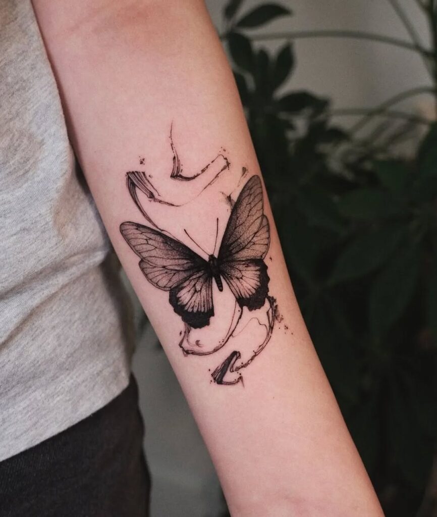 This forearm tattoo features a finely detailed butterfly surrounded by abstract strokes that resemble flowing energy or movement.