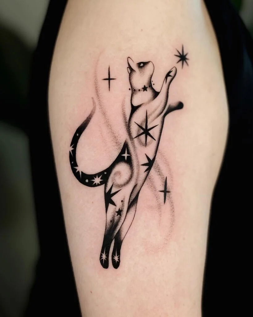 This tattoo features a leaping cat surrounded by sparkling stars, its body marked with cosmic patterns and swirls.