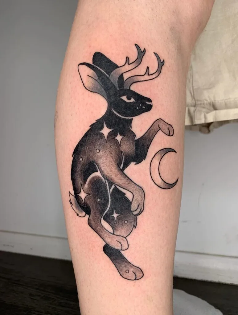 This tattoo portrays a mystical jackalope, its dark body filled with star-like constellations and glowing celestial accents.