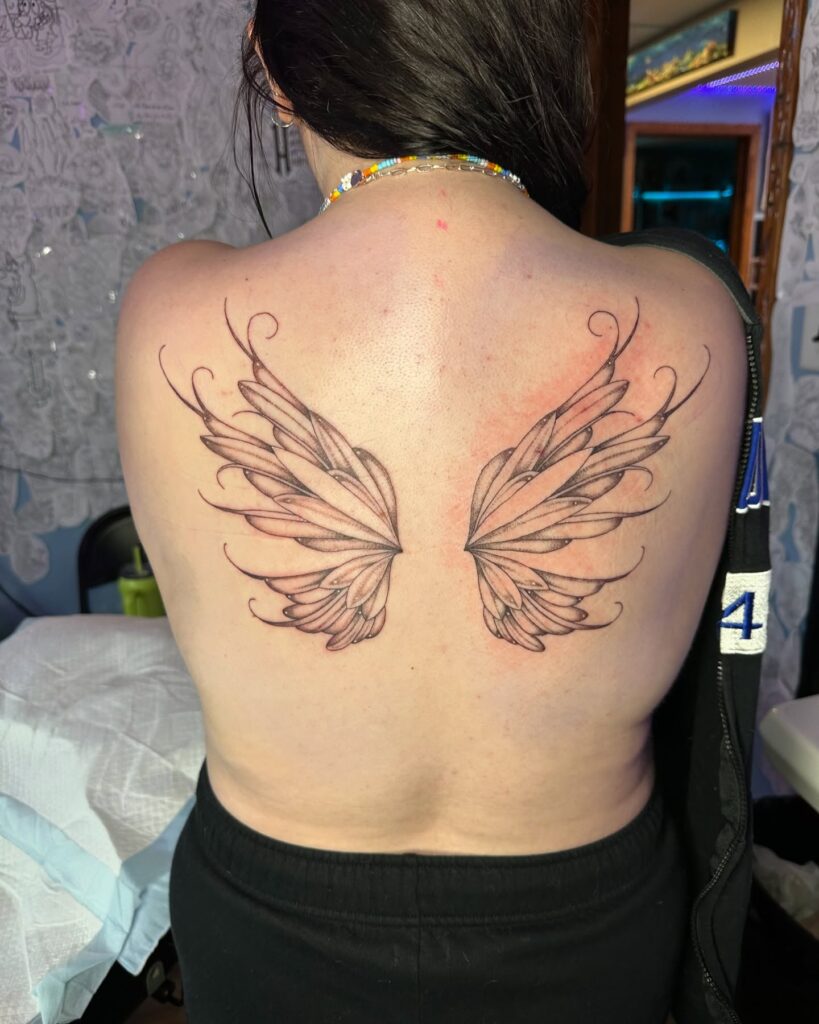 This back tattoo features a pair of graceful wings, drawn with flowing lines and petal-like details. The soft shading enhances their light, airy texture, making them appear almost translucent, like wings ready to lift off.