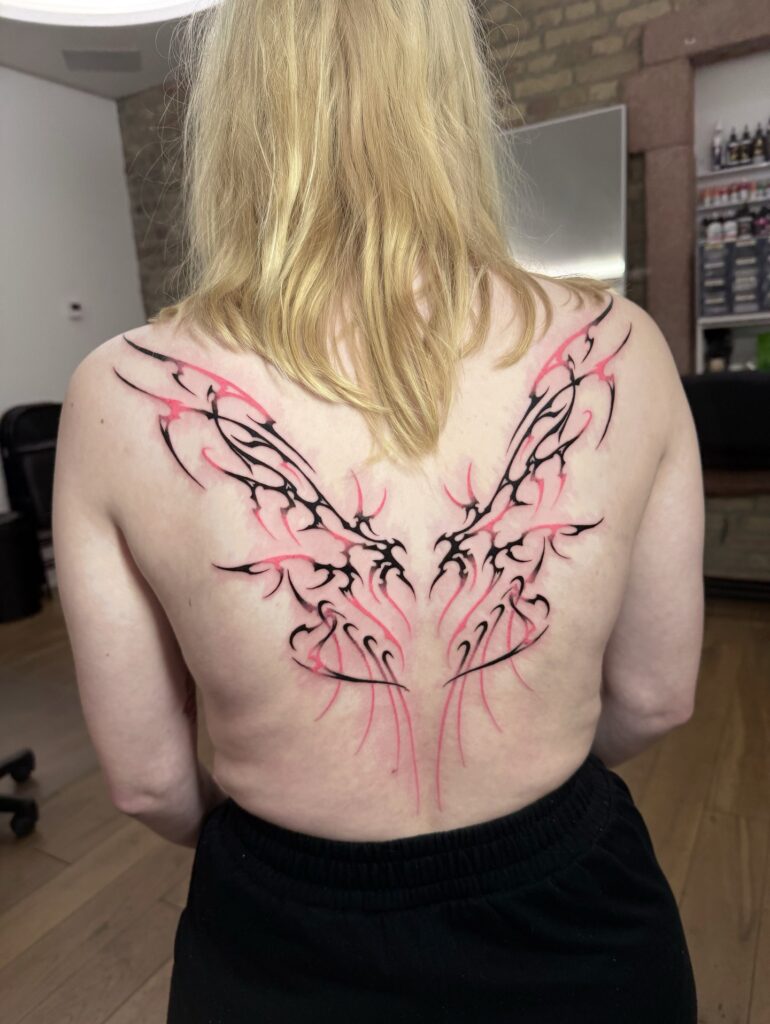 This back tattoo showcases a pair of wings shaped with flowing black lines highlighted by glowing pink accents.