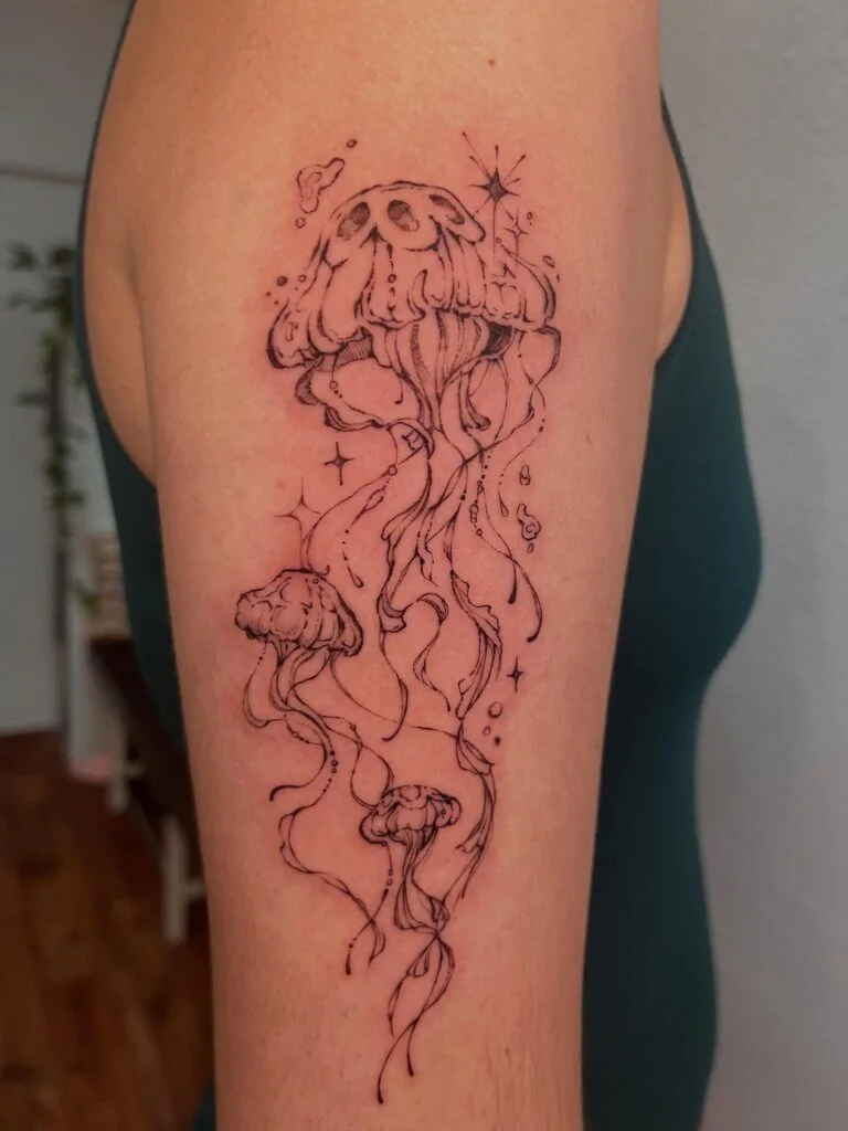This tattoo captures the graceful drift of jellyfish, their delicate forms floating upward with flowing tendrils.
