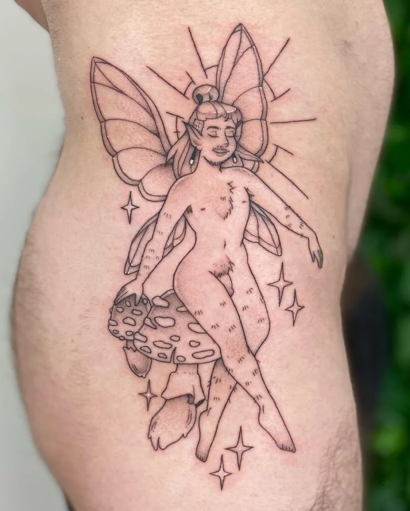 This tattoo beautifully depicts a fairy with delicate wings, seated gracefully on a spotted mushroom. The figure’s serene expression, flowing hair, and radiant details emphasize both softness and strength.