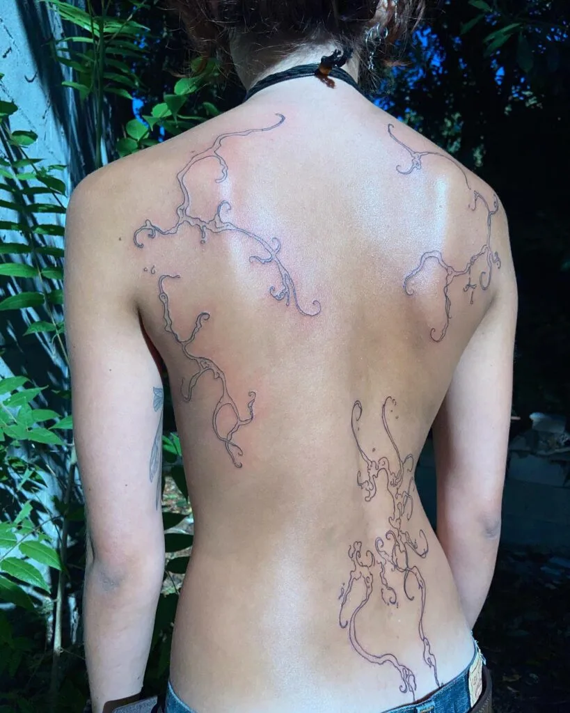 This full-back tattoo features delicate, meandering lines that resemble vines or drifting currents of magical energy.