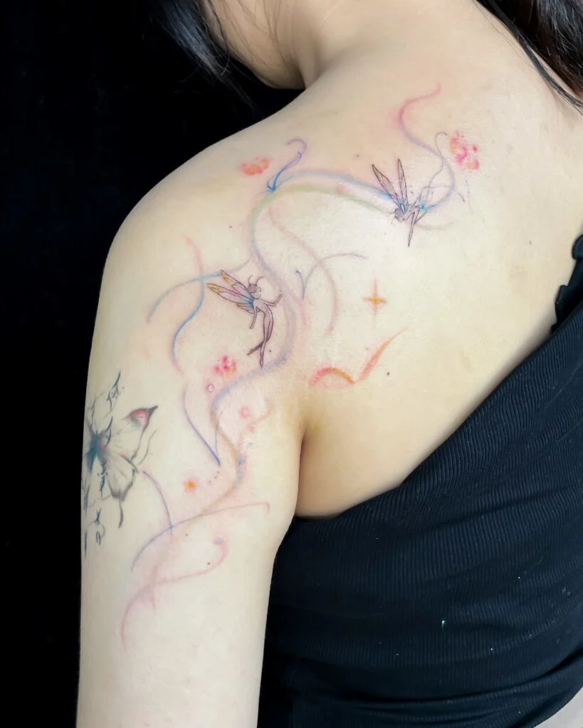 This tattoo creates a dreamy scene with delicate fairies drifting among soft mist-like trails across the shoulder.