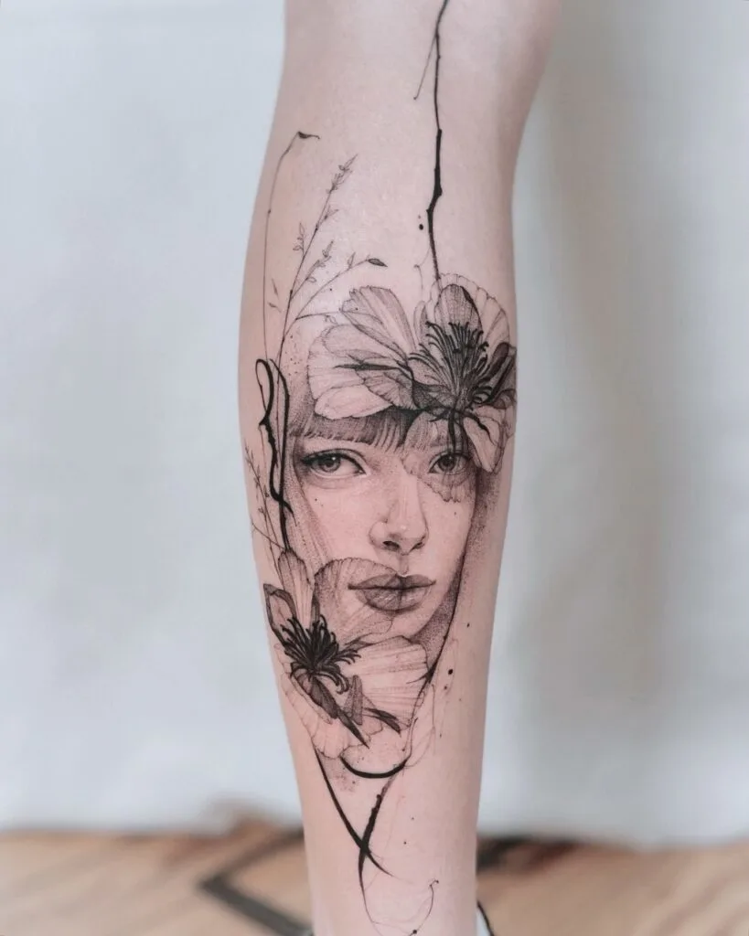 This tattoo blends the delicate realism of a woman’s face with ethereal floral elements flowing seamlessly around her.