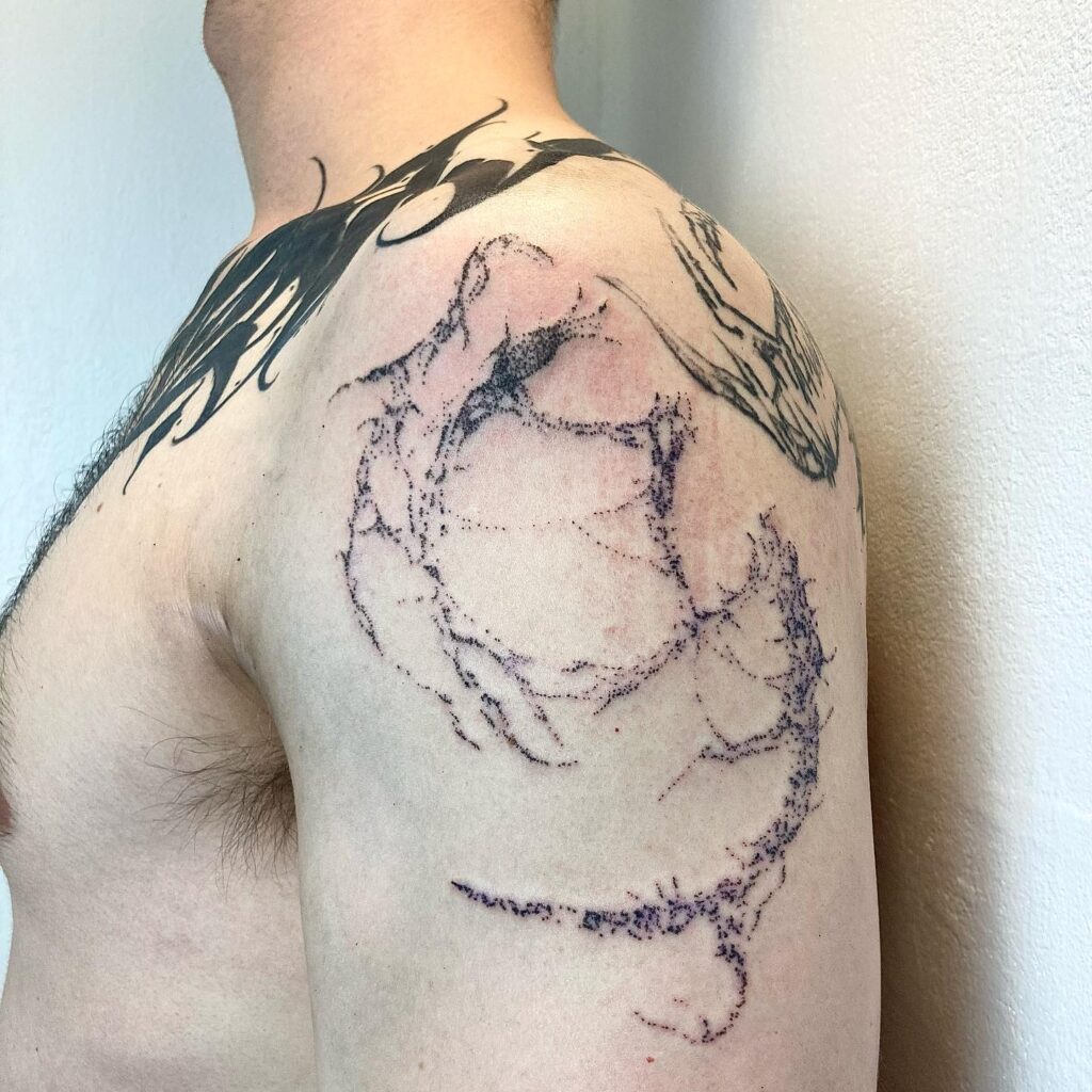 This shoulder tattoo features delicate, fragmented lines resembling drifting smoke or fading energy across the skin.