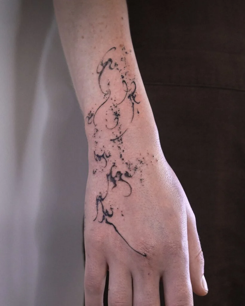This tattoo uses flowing abstract lines and scattered dotwork to create a fluid, dreamlike design across the hand. The delicate curves twist and spiral gracefully, giving the impression of energy moving freely beneath the skin.