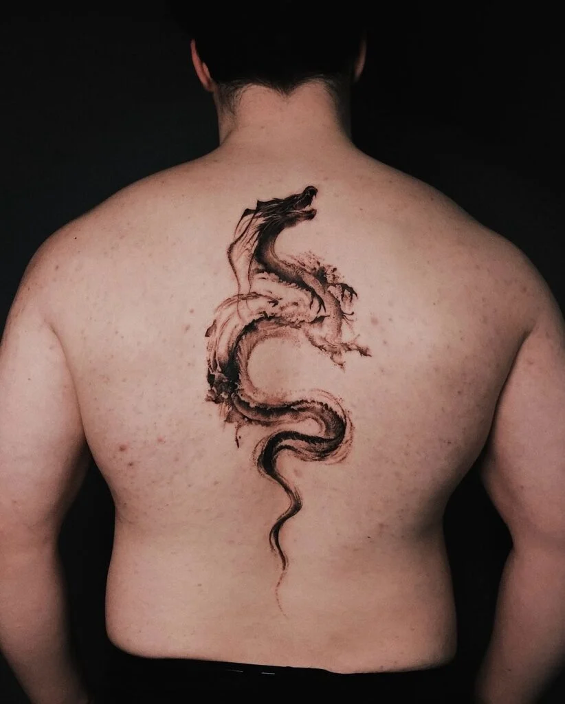 This tattoo flows down the spine with the elegance of an ink-wash painting, portraying a dragon in motion.