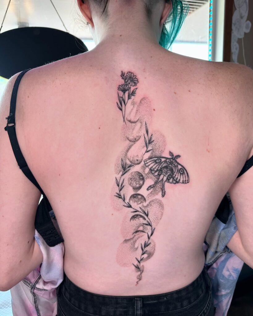 This back tattoo flows gracefully down the spine, combining florals, lunar phases, and a detailed moth. The composition begins with delicate blossoms at the top, leading into swirling leaves that entwine with moon cycles.