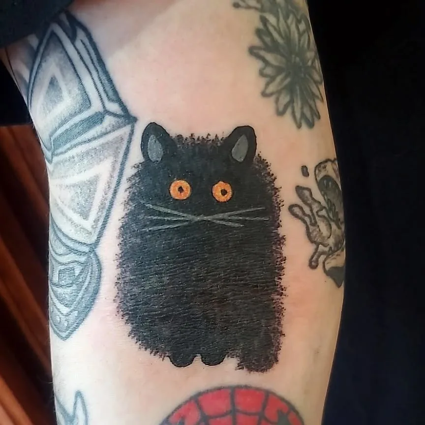 This tattoo features a fluffy black cat with glowing orange eyes that immediately capture attention. Its wide, unblinking stare creates an aura of mystery, blending playfulness with supernatural charm.