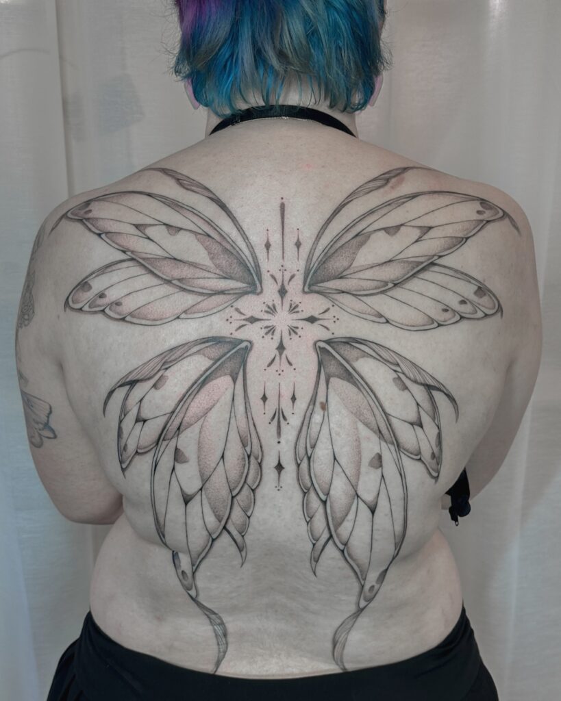 This back tattoo features elegant ornamental fairy wings that spread gracefully across the shoulders and spine. The wings are designed with delicate shading, flowing lines, and layered textures that resemble both petals and feathers.