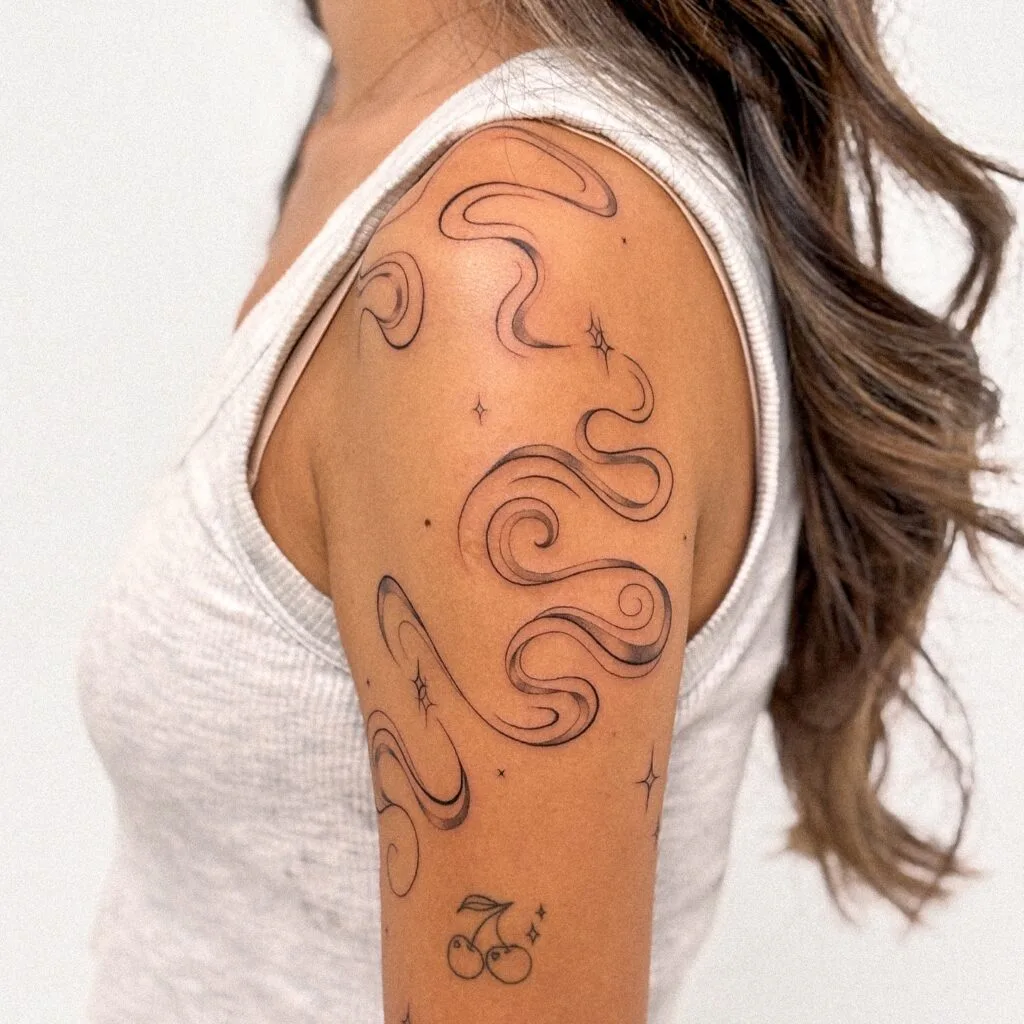 The design feels light and airy, almost as if it’s floating above the skin. Small star accents scattered between the flowing shapes add a celestial sparkle, enhancing its ethereal atmosphere.
