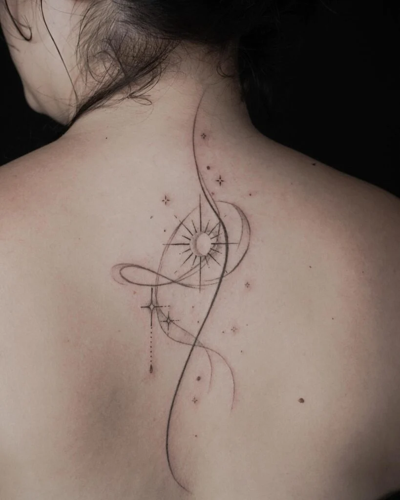 The sun radiates balance, the moon reflects mystery, and the stars scatter like guiding lights across the skin. Its placement along the upper back enhances its luminous presence, making it feel both delicate and powerful.