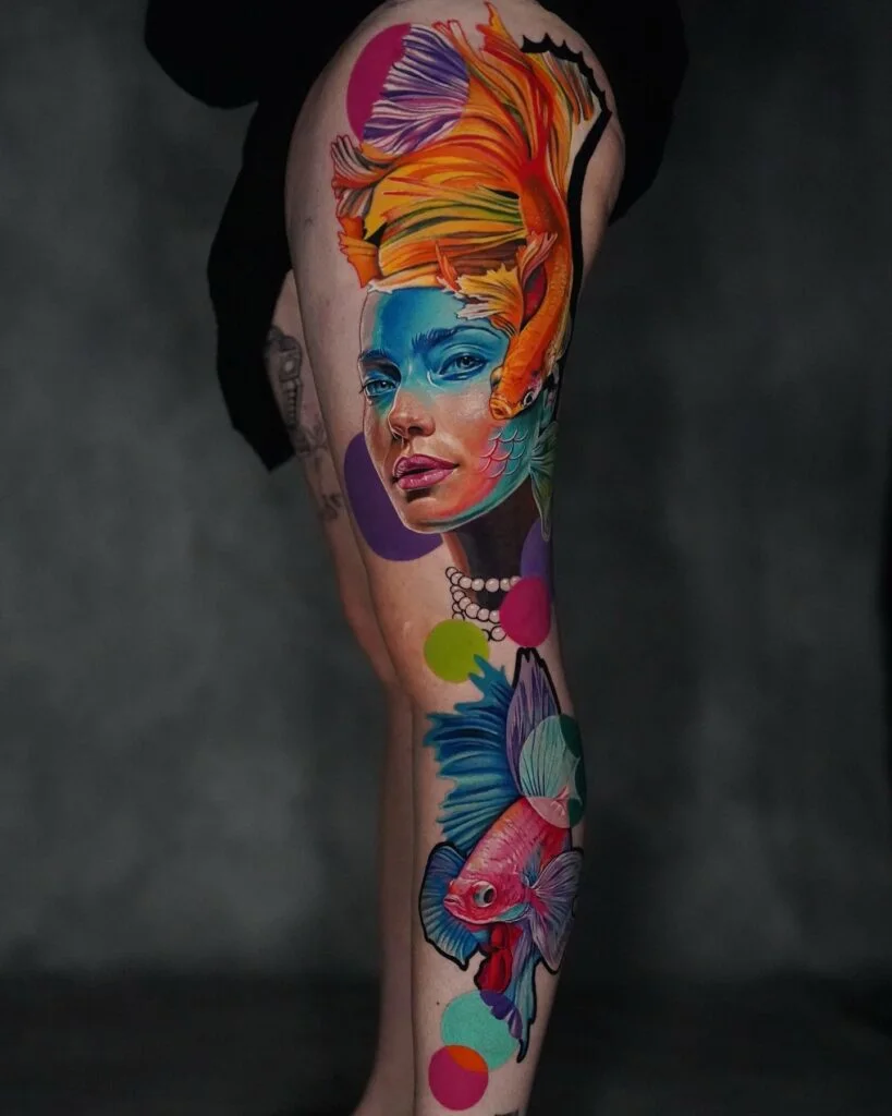 This breathtaking full-leg piece blends vibrant realism with surreal fantasy, featuring luminous betta fish and a goddess-like figure.
