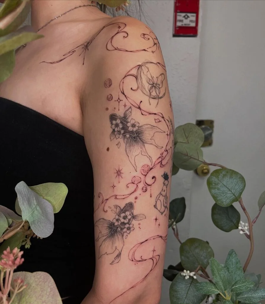 The composition moves fluidly along the arm, giving the design an enchanting rhythm. It feels light, mystical, and dreamlike, symbolizing adaptability, resilience, and the gentle power of nature. A perfect choice for someone drawn to ethereal underwater magic.
