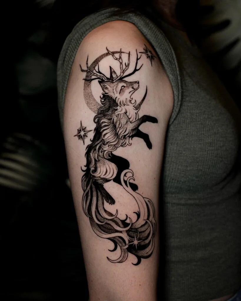 This tattoo portrays a magical fox with antlers, its body flowing into curling, smoke-like trails that feel dreamlike and free.