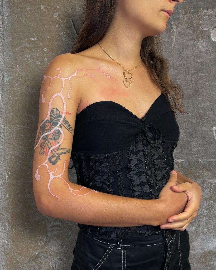 This tattoo features flowing white ink patterns that ripple across the shoulder and arm like streams of energy. Its soft, glowing appearance gives it a subtle yet otherworldly presence, blending seamlessly with the skin.