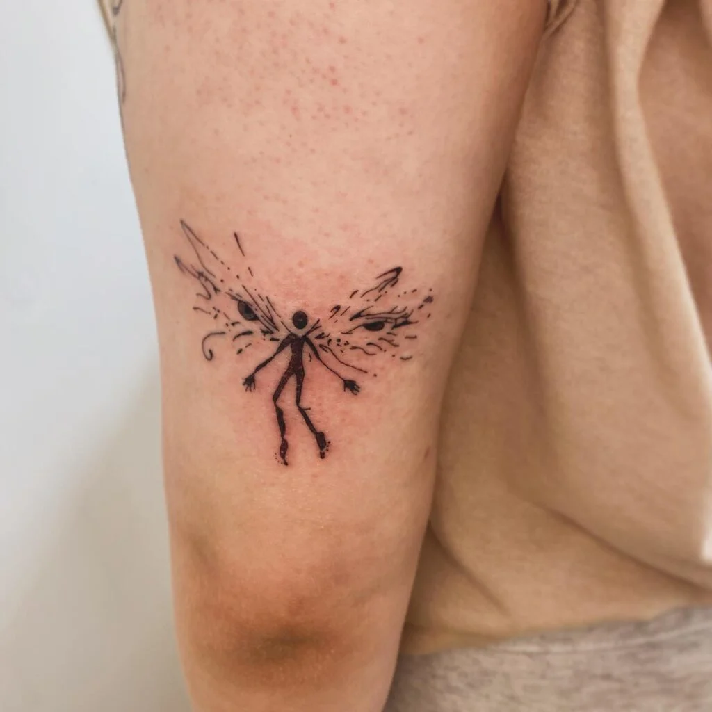 This tattoo features a minimalist fairy-like figure with elongated limbs and wings formed from scattered strokes and splashes.