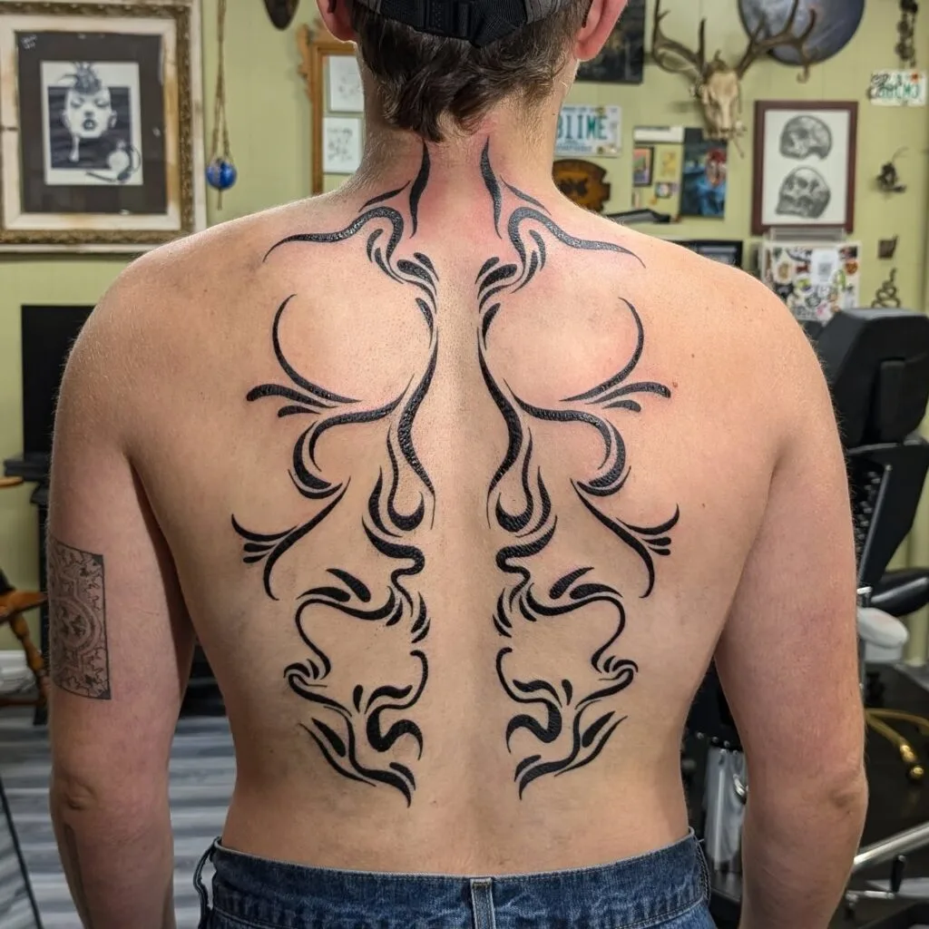 This tattoo spans the entire back with bold, symmetrical patterns that curve and twist like flowing energy.