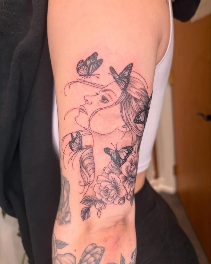 This tattoo portrays a serene profile of a woman surrounded by butterflies and blooming flowers, creating a dreamlike atmosphere.