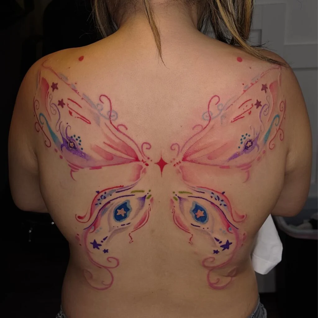 This full-back tattoo transforms the skin into a canvas for delicate watercolor-inspired butterfly wings. Soft pinks, purples, and blues flow gracefully, accented by whimsical swirls, stars, and abstract patterns.