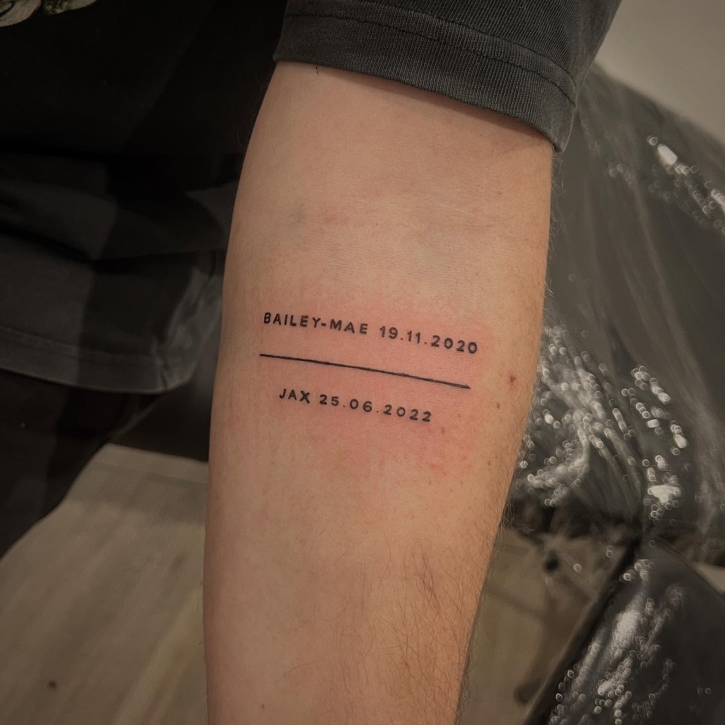 This minimalist tattoo features the names and birth dates of two children, separated by a clean horizontal line.