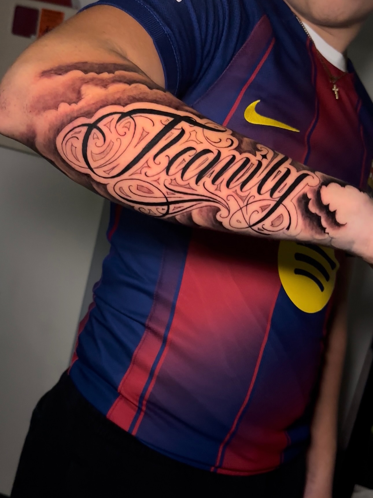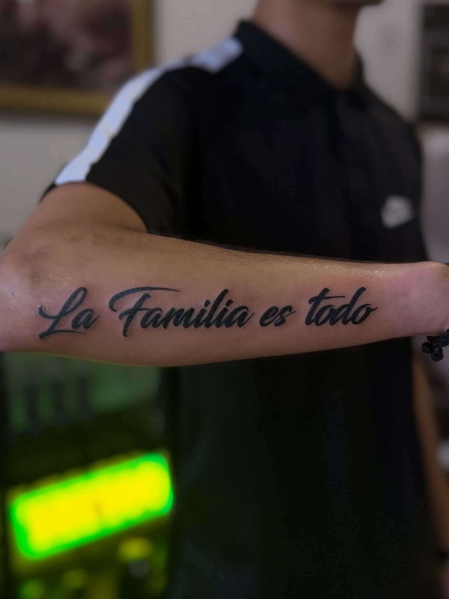The phrase translates to family is everything, turning the tattoo into a powerful statement about loyalty, love, and the importance of family.