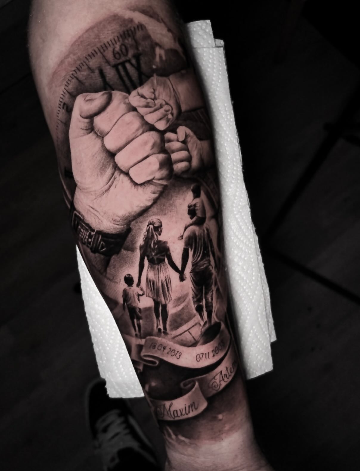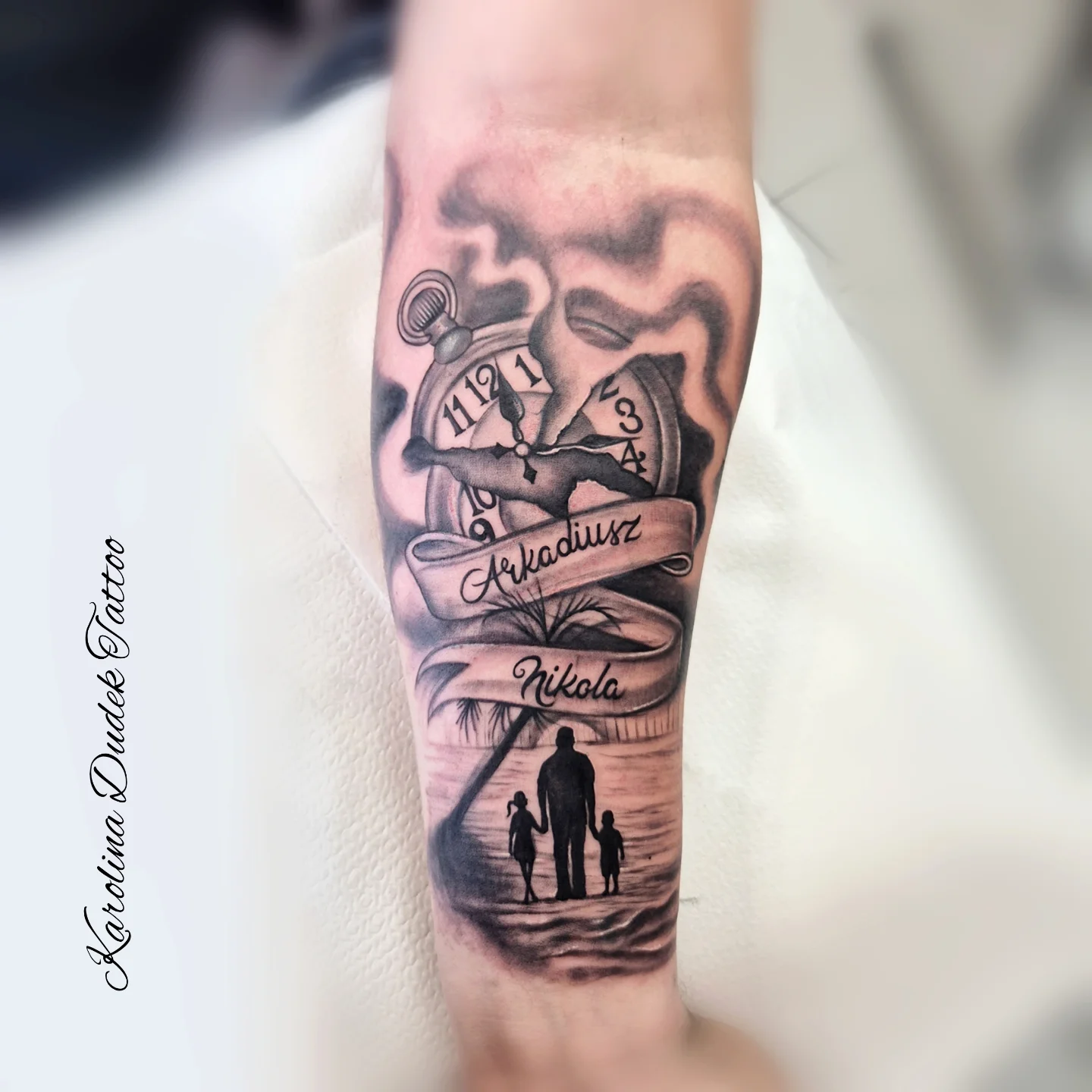 This striking forearm tattoo combines time symbolism with a heartfelt family scene.