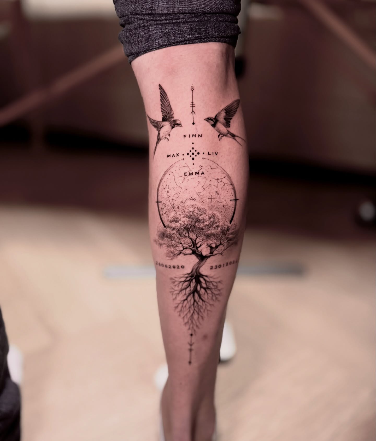 This striking calf tattoo combines several symbolic elements into a clean and balanced family tribute.