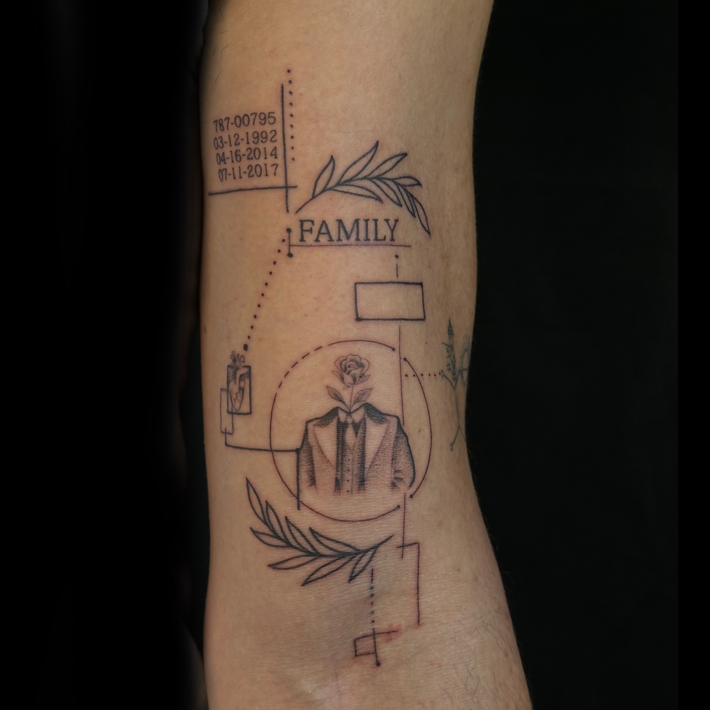 Leaves and simple shapes frame the composition, giving the tattoo balance while representing growth, connection, and the story of family.