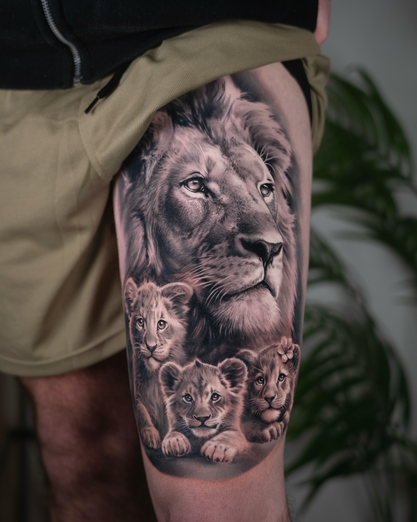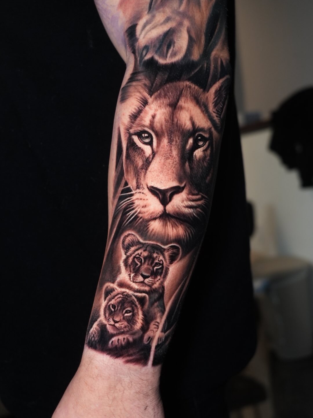 This striking tattoo features a powerful lion surrounded by two lion cubs, creating a meaningful symbol of fatherhood and protection.