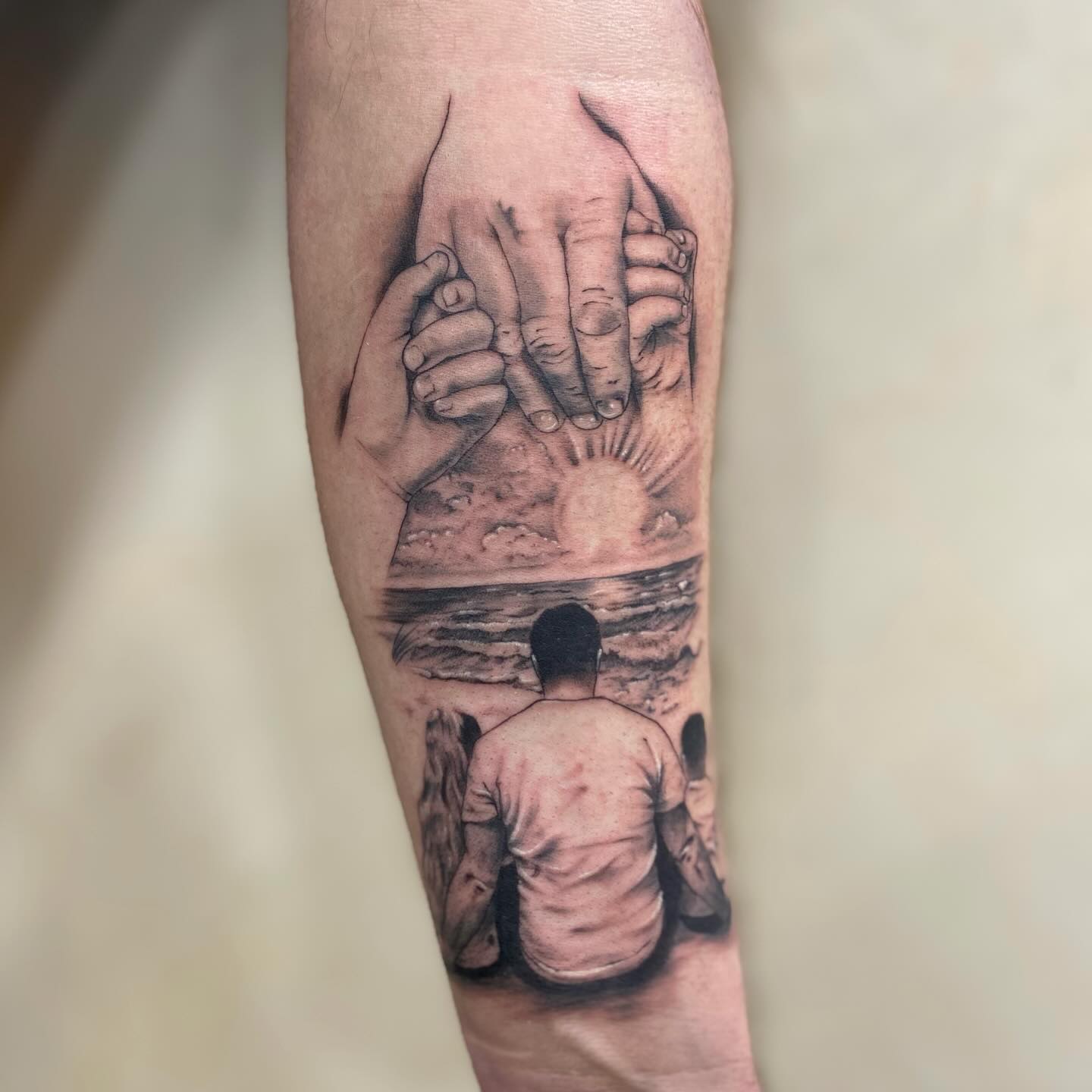 This detailed forearm tattoo centers on a powerful image of a parent’s hand holding the small hands of two children.