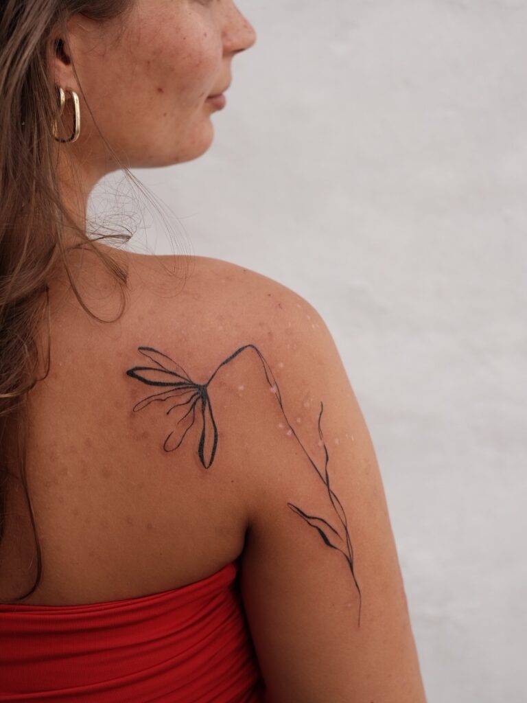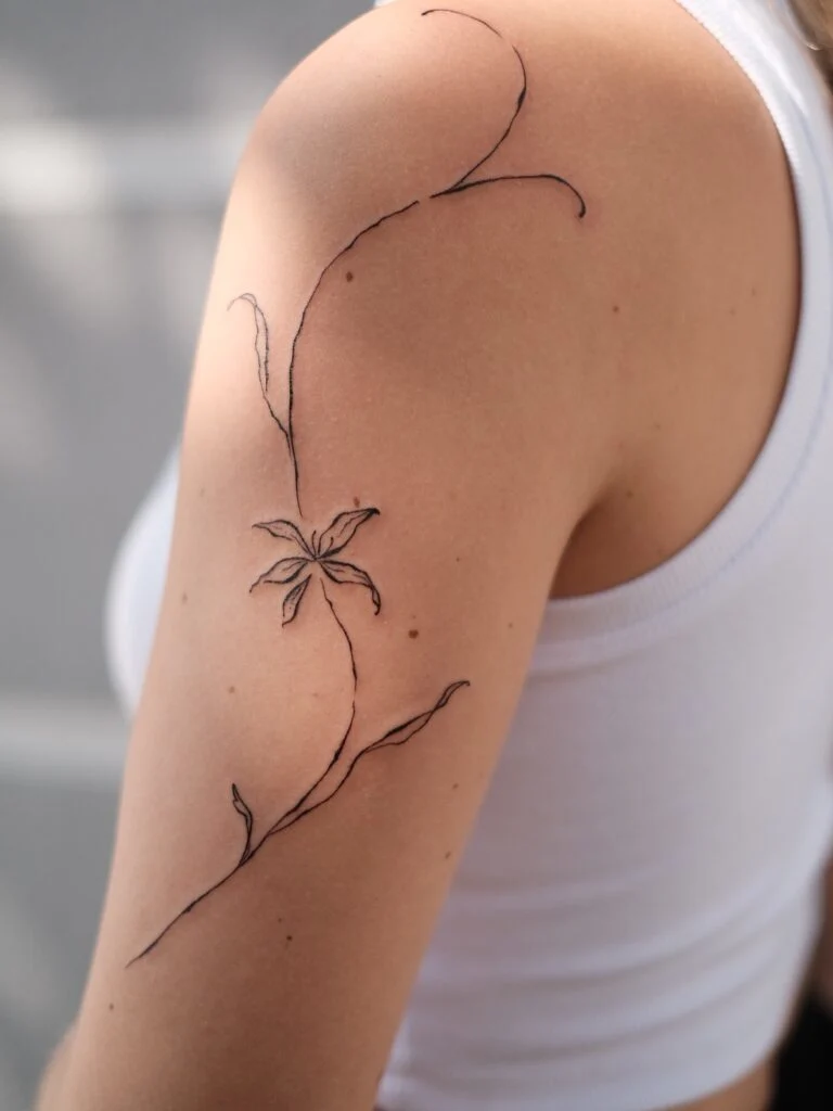 This fine line tattoo features a delicate flower placed gracefully on the shoulder, flowing seamlessly into soft trailing lines.