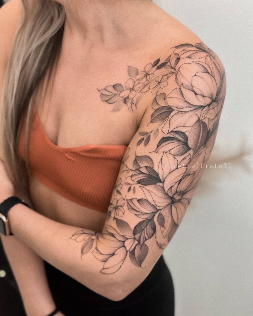 The placement highlights the shoulder’s shape while extending down the arm, offering a graceful and artistic floral tattoo for women who love refined body art.