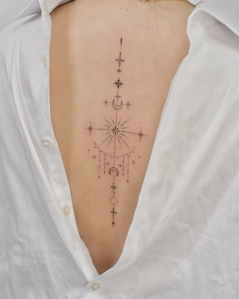 This fine line tattoo runs gracefully along the spine, combining floral elements with celestial and ornamental details.