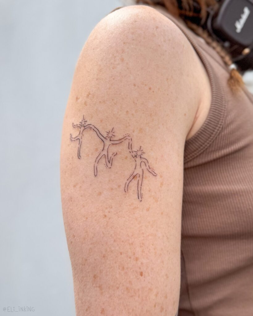 This tattoo features whimsical human-like figures drawn in fine lines, connected with sparkling star details above them.