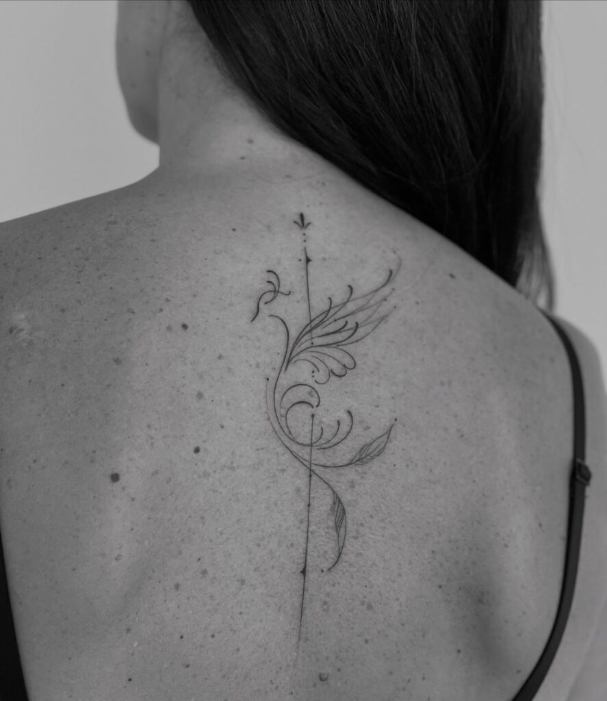 This fine line tattoo depicts a graceful phoenix rising along the spine, created with flowing, ornamental strokes.