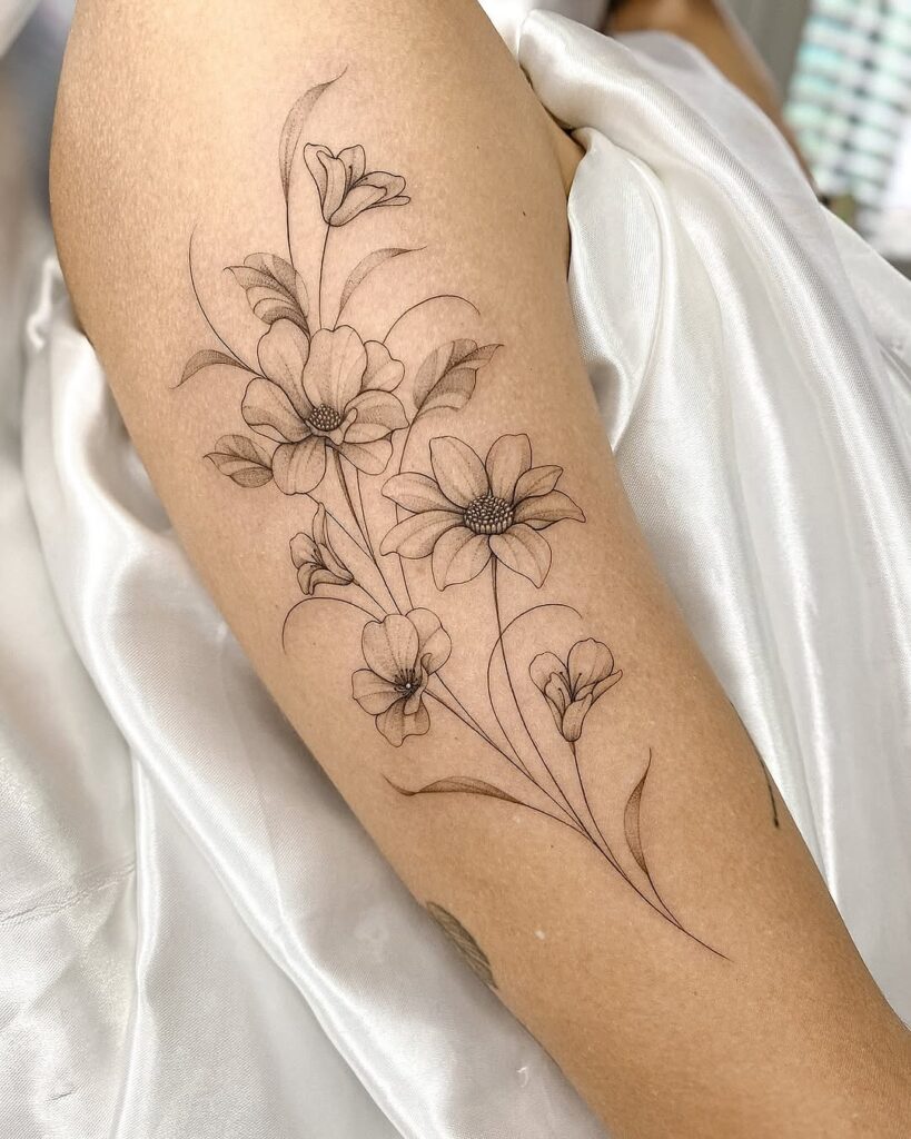 The thin outlines highlight each petal with subtle precision, giving the design a refined and airy feel. Its placement on the upper arm allows the tattoo to flow naturally with the body’s shape.