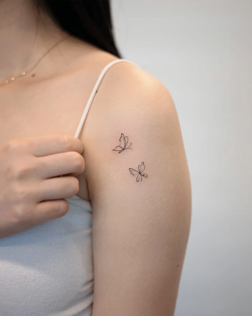 This tattoo features two delicate butterflies drawn with fine lines, resting beautifully on the upper shoulder.