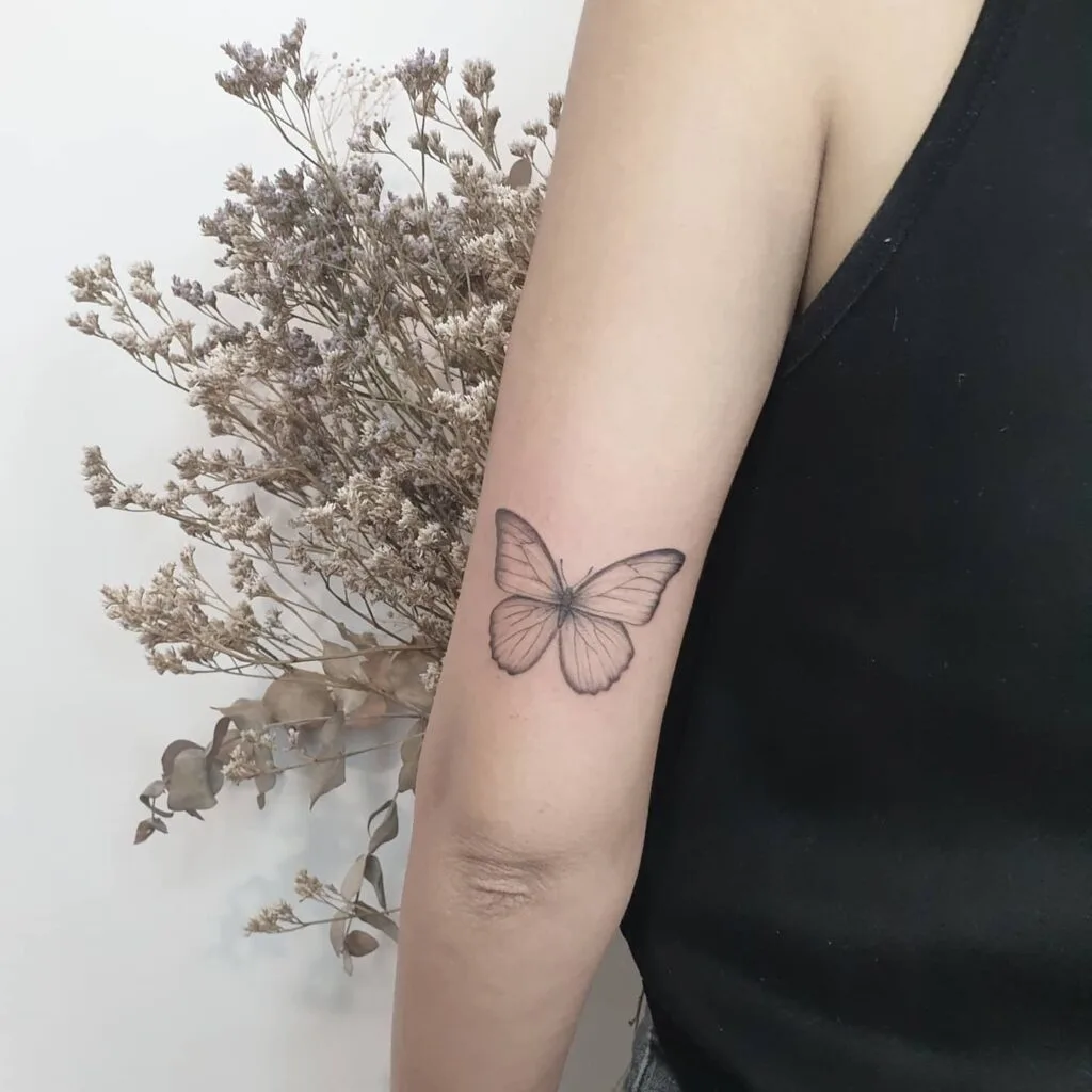 This tattoo features a beautifully shaded butterfly, designed with fine lines that blend into soft, delicate gradients.