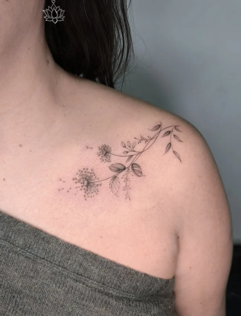 This tattoo beautifully depicts delicate dandelions paired with flowing leaves, placed gracefully along the collarbone.