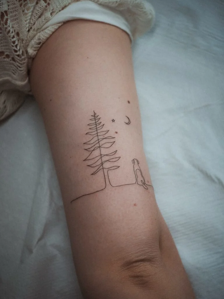 Fine Line Dog and Tree Tattoo with Moon and Star