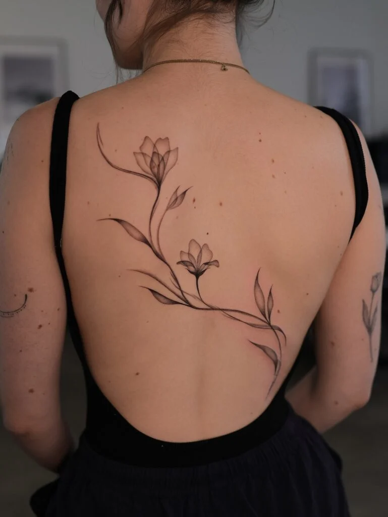 This tattoo features elegant flowers with long stems and leaves, stretching gracefully across the back in a flowing design.