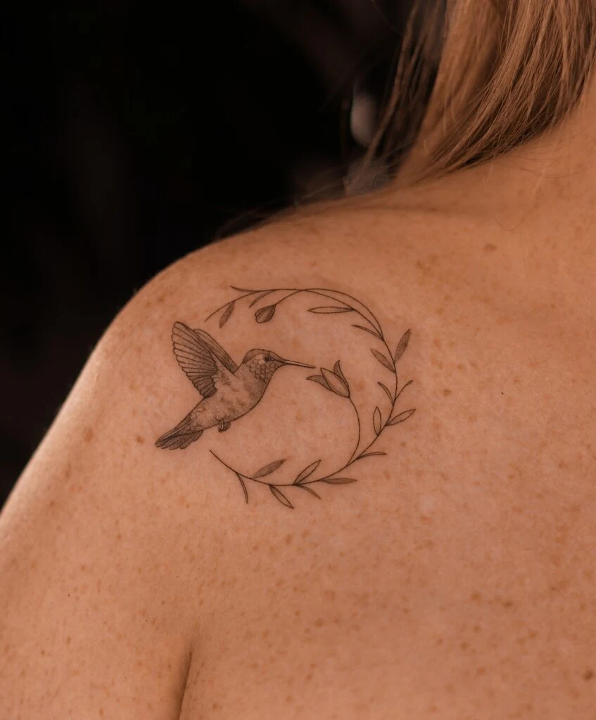 This tattoo shows a beautifully detailed hummingbird in flight, surrounded by an arch of delicate leafy branches.